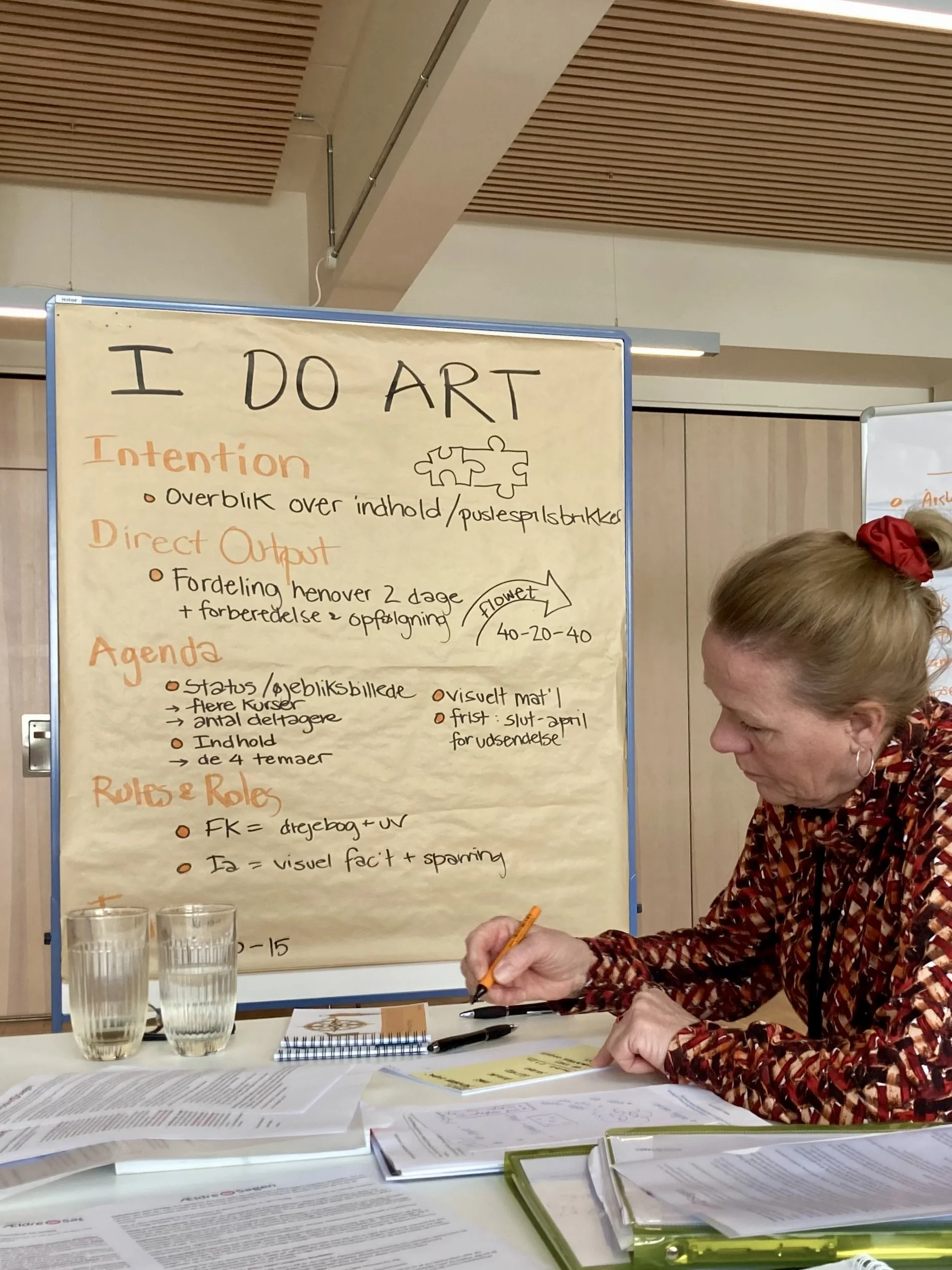 I planlægningen bruger jeg ofte modellen “I DO ART”, hvor fokus er på Intention, Direct Output, Agenda, Roles & Rules og Timeframe.